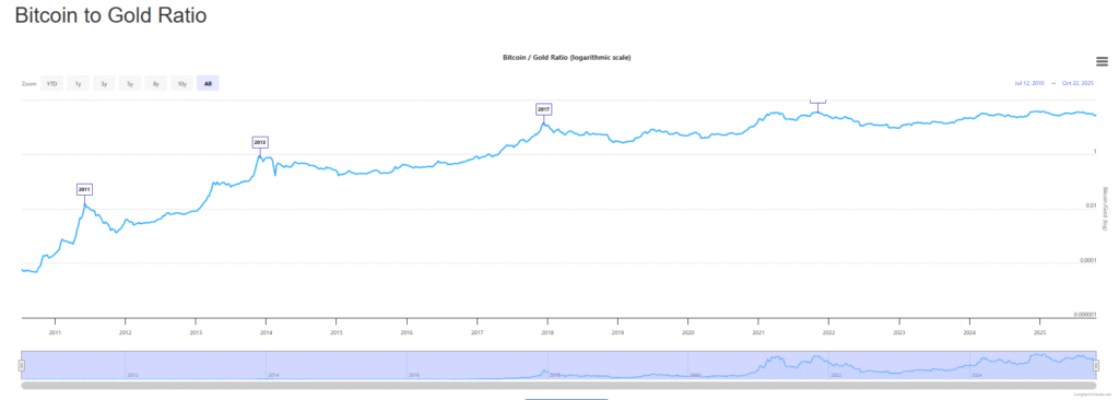(Longtermtrends 데이터: Bitcoin-to-Gold Ratio Chart)